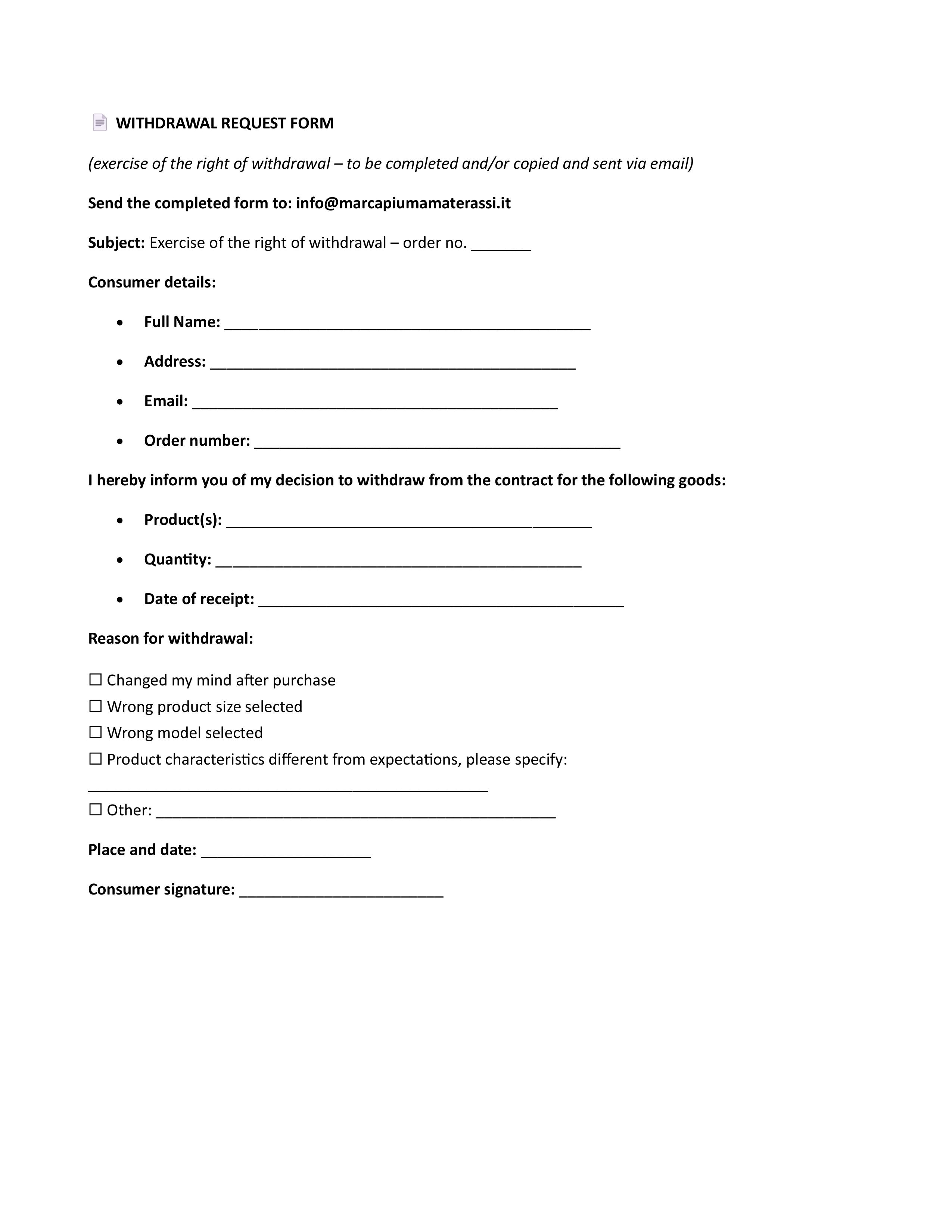 (exercise of the right of withdrawal – to be completed and/or copied and sent via email)