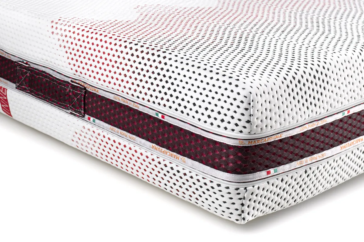 The first red layer is made of DRYFEEL® foam, an innovative, ultra-breathable and particularly fresh material; made entirely with certified open cell structure. The mesh allows humidity to pass through quickly and effectively, ensuring maximum comfort in all conditions. It has a particular hollow on the surface with a honeycomb texture with a massaging effect, differentiated into zones.