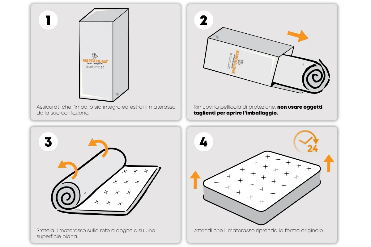 The Marcapiuma mattress is shipped vacuum-rolled with a double nylon casing, inserted in a resistant box which ensures integrity, hygiene and guarantees easier transport; after being opened and unrolled it will return to its original size in just a few hours.