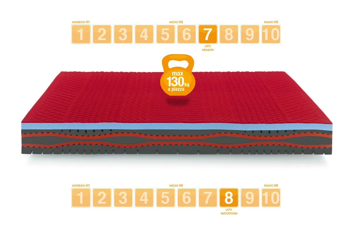 Firmness: Memory Foam 7/10 (enveloping red side, all year round) – Waterfoam 8/10 (ergonomic black side)