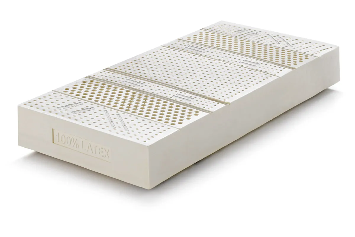 El colchón de látex 100% espuma está formado por un único bloque de látex de doble nido de abeja de alta densidad de 18 cm de altura con más de 70 kg/m³. Esto lo convierte en un colchón indeformable con el tiempo, especialmente transpirable, antibacteriano e hipoalergénico.