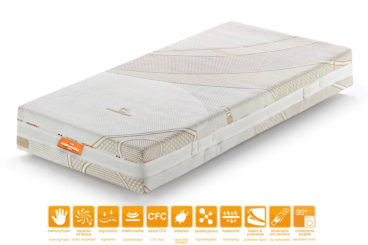 Colchón ortopédico en Memory Foam con grado de firmeza H2 MEDIO/SUAVE, con 7 zonas de apoyo diferenciadas, compuesto por 3 capas.