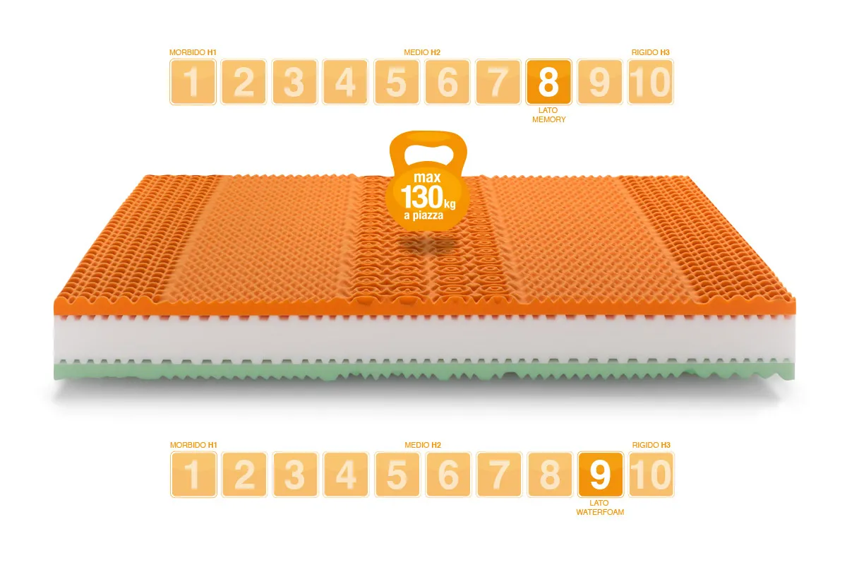 La primera capa naranja mide hasta 4 cm de altura y está compuesta por Bio Memory Soy, una espuma viscoelástica especial de memoria lenta, termosensible y automodelable. Es un colchón Bio Memory Foam, la espuma de hecho está enriquecida con esencias de plantas de soja. Está diseñado con una forma particular y células de masaje en la parte central. Es un colchón con memoria relajante ideal para un descanso saludable y un descanso natural.