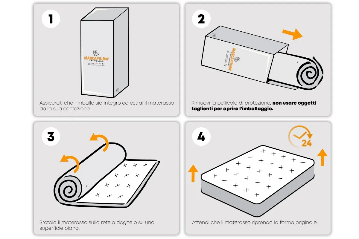 Le matelas Marcapiuma est expédié enroulé sous vide avec une double enveloppe en nylon, inséré dans une boîte résistante qui assure l'intégrité, l'hygiène et garantit un transport plus facile ; Après avoir été ouvert et déroulé, il retrouvera sa hauteur d'origine en quelques heures seulement.