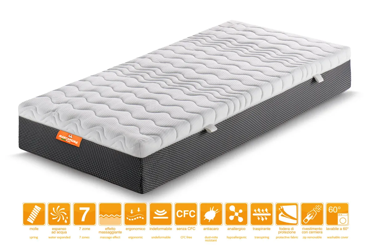 À l'intérieur, le système de ressorts est réalisé avec 800 ressorts insérés individuellement dans des sacs indépendants, assemblés avec une disposition de sept zones différenciées, différentes en densité de ressorts : cette dernière sera plus grande là où il faut privilégier le soutien et moins grande là où un meilleur accueil est indispensable, par exemple au niveau des épaules et des jambes.