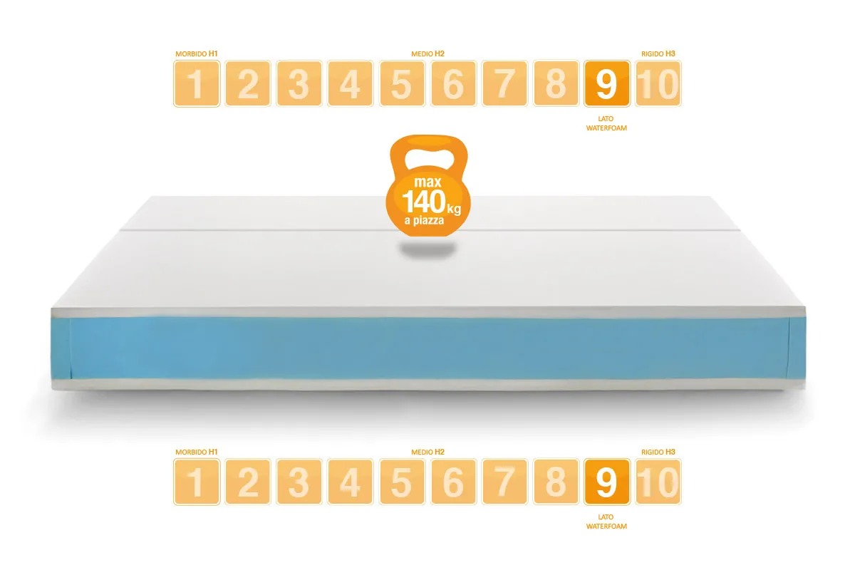 Le caisson blanc de 19 cm en WaterFoam agit comme une structure de renfort périmétrique, idéale pour permettre aux ressorts de toujours fonctionner perpendiculairement à la surface de couchage. Il s'agit de la structure de support du matelas orthopédique, conçue pour garantir un confort maximal et un soutien du dos.