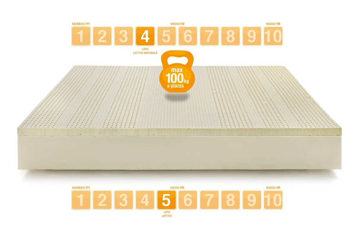 Grado di rigidità: 4/10 superficie in Puro Lattice Naturale - 5/10 schiuma di Lattice al 100% di Prima Scelta